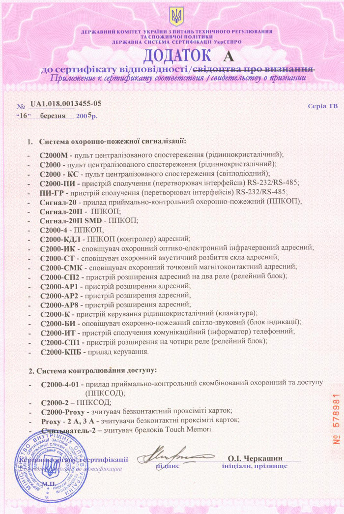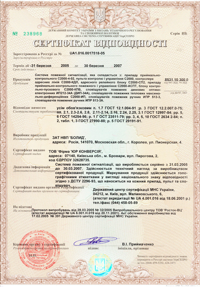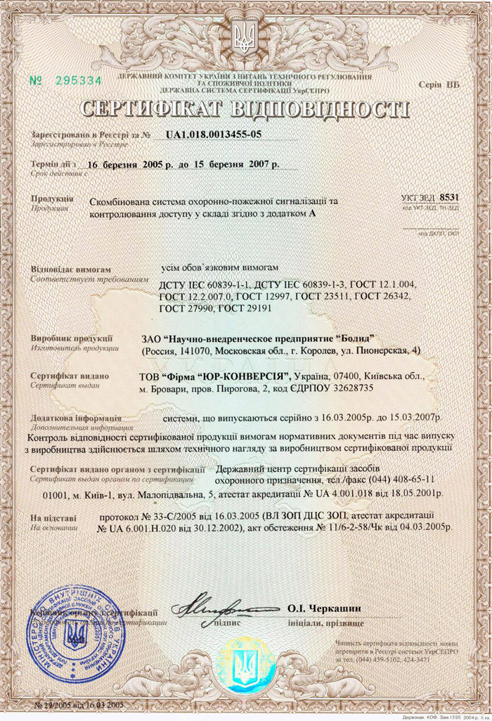 По результатам испытаний получены Сертификат соответствия, выданный Государственным центром сертификации охранного назначения, и Сертификат пожарной безопасности, выданный Государственным центром сертификации МЧС Украины.