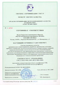 По результатам работы комиссии нашей организации был выдан новый СЕРТИФИКАТ СООТВЕТСТВИЯ требованиям ГОСТ Р ИСО 9001-2001 (ИСО 9001:2000) со сроком действия с 08.11.06 г. до 08.11.09 г. Регистрационный № РОСС RU.ИК32.К00028.