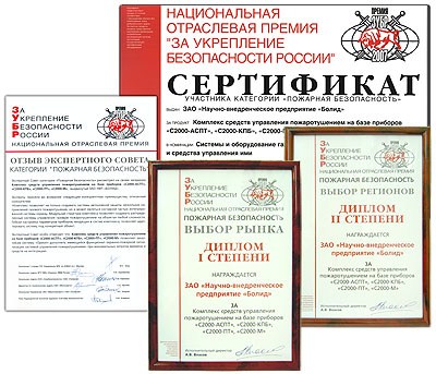 - Диплом I степени за Комплекс средств управления пожаротушением на базе приборов "С2000-АСПТ", "С2000-КПБ", "С2000-ПТ", "С2000-М" в номинации "Выбор рынка"