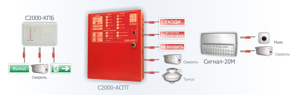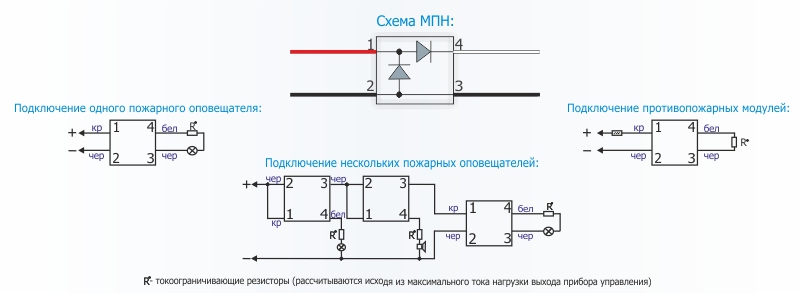 Функции контроля выходов реализованы в ряде приборов, выпускаемых нашим Предприятием: С2000-АСПТ, С2000-КПБ, Сигнал-20П, Сигнал-20М. Для подключения оповещателей или противопожарных модулей к этим приборам используются диодные схемы, которые позволяют контролировать линии управления как в выключенном, так и во включенном состояниях.