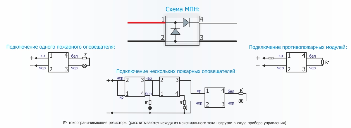 Диодные схемы должны устанавливаться непосредственно на контактах оповещателей или исполнительных устройств. Однако, монтировать диоды на клеммах неудобно, и без дополнительных монтажных коробок зачастую обойтись нельзя.