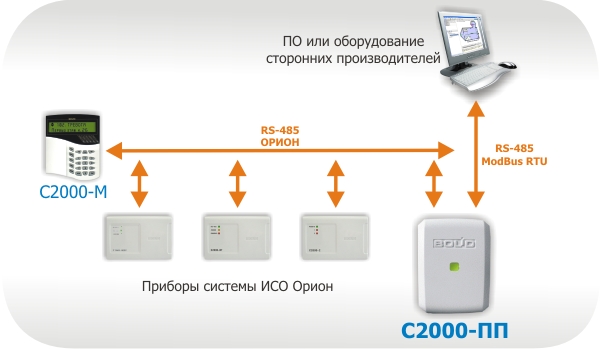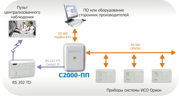 С2000-ПП предназначен для интеграции системы охранно-пожарной сигнализации системы "Орион" в объектовое оборудование сторонних производителей по интерфейсу Modbus RTU, для передачи событий на передатчик RS-202TD в протоколе Ademco Contact ID, мониторинга событий в системе Орион, управления включением/выключением реле, взятием/снятием зон и разделов.