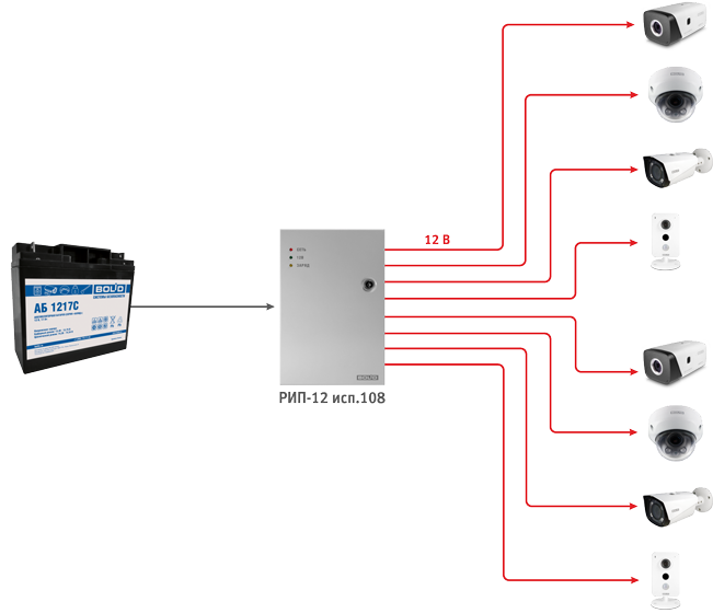 • питание видеокамер и других устройств с номинальным напряжением питания 12 В (суммарный ток 5 А)