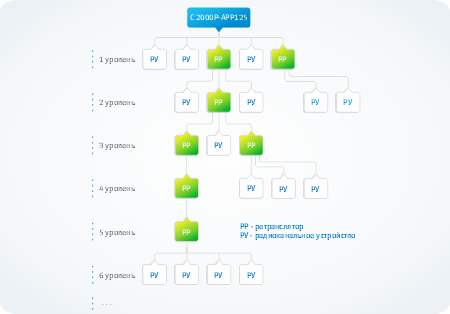 - Цепь последовательной ретрансляции может включать до 8 уровней, что позволяет увеличить радиус покрытия системы в 8 раз