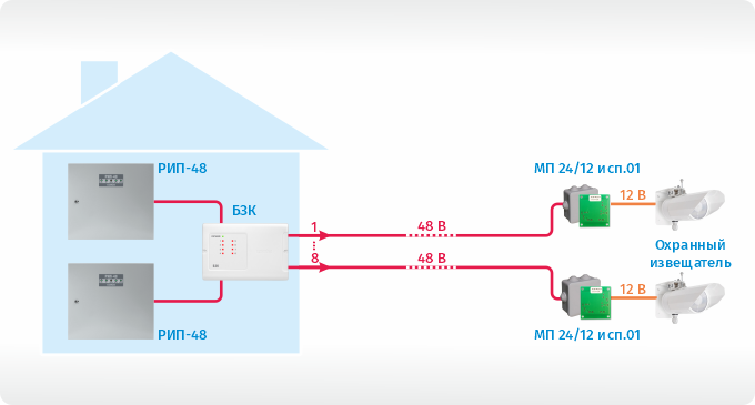 Рисунок 2. Пример использования БЗК исп.03 с РИП-48 исп.01 на периметре: подключение к РИП-48 двух БЗК исп.03 по топологии «кольцо» и последующему подключению к линиям БЗК нагрузки через преобразователи напряжения.