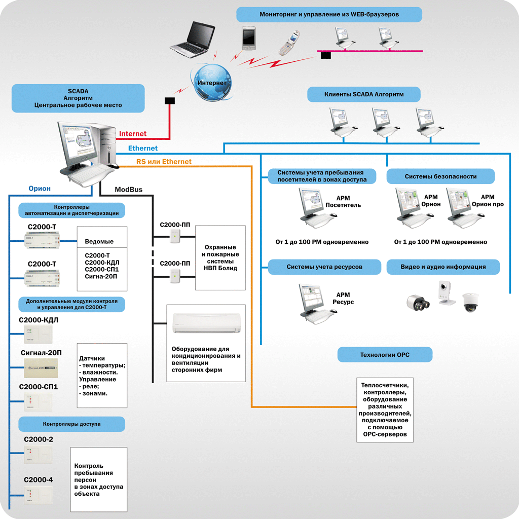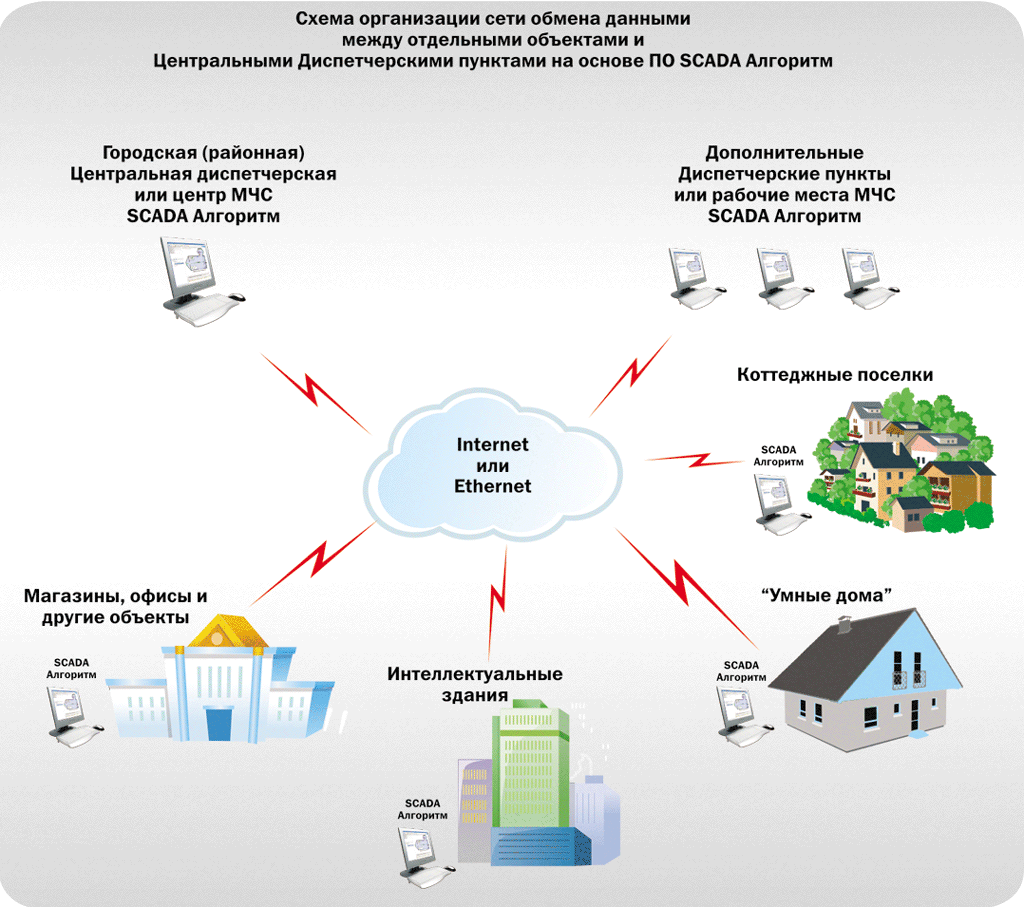 • SCADA Алгоритм позволяет создать распределенную сеть клиентских рабочих мест различного назначения по опросу контроллеров, получения данных от интегрируемых систем, мониторингу ситуации и управления объектом. Вся получаемая информация может транслироваться по сети на рабочее место-диспетчерский пункт по сети Ethernet или Internet без ограничения на тип соединения (например по модему со скоростью от 50Кбит/сек);