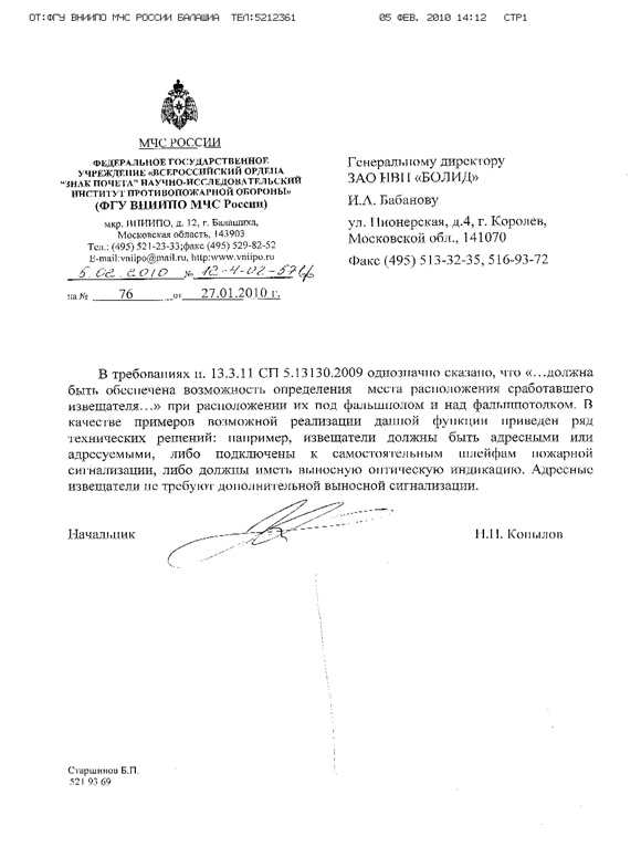 Письмо ФГУ ВНИИПО МЧС России о применении ВУОС с адресными пожарными извещателями (82 Кб)