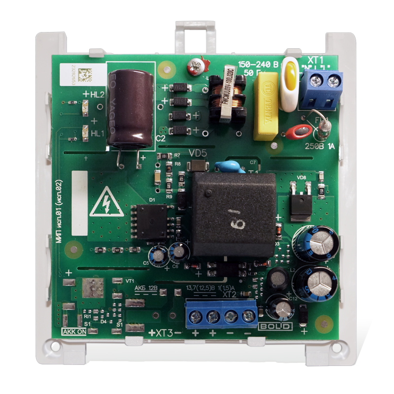 "МИП-12 исп.01" - модуль источника питания 12В 1А (мах 1.5); рекомендуемая емкость АБ 4.5Ач, 7Ач или 12 Ач; световая индикация; защита: от глубокого разряда, от КЗ; крепление на DIN рейку; пластиковый корпус, не поддерживающий горение.