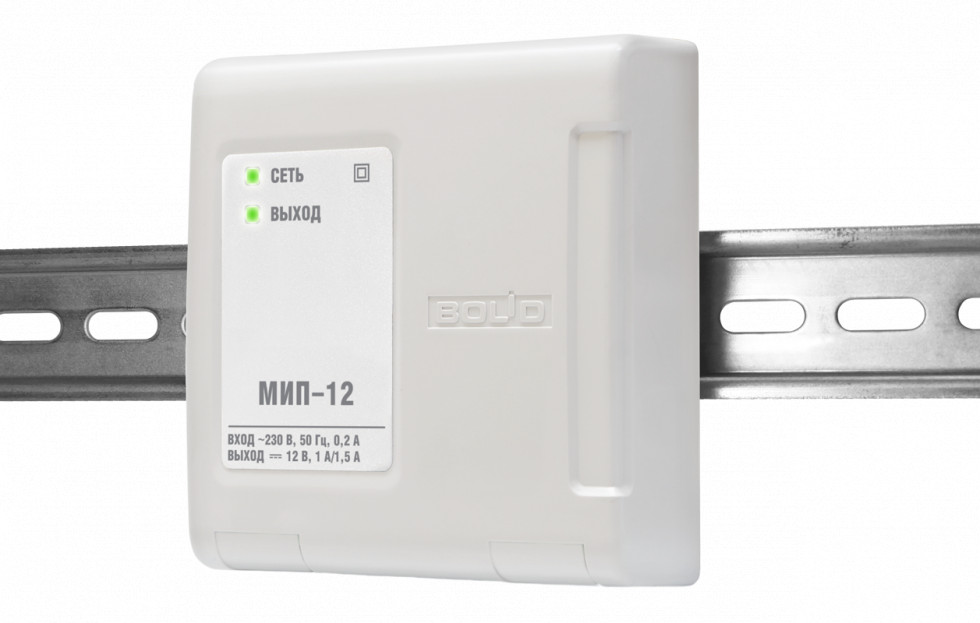 "МИП-12 исп.02" - модуль источника питания 12В 1,5 А стабилизированный; световая индикация; защита от КЗ; крепление на DIN рейку; пластиковый корпус, не поддерживающий горение.
