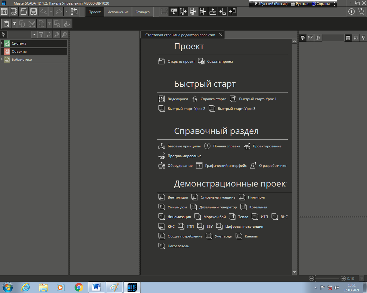 Присвоим проекту имя «Панель Управления М3000-ВВ-0010» и укажем путь к хранилищу, который предлагает МАСТЕРСКАДА 4Д по умолчанию.Рисунок 6 Проект с именем «Панель Управления М3000-ВВ-0010» со стартовой страницей редактора проектов