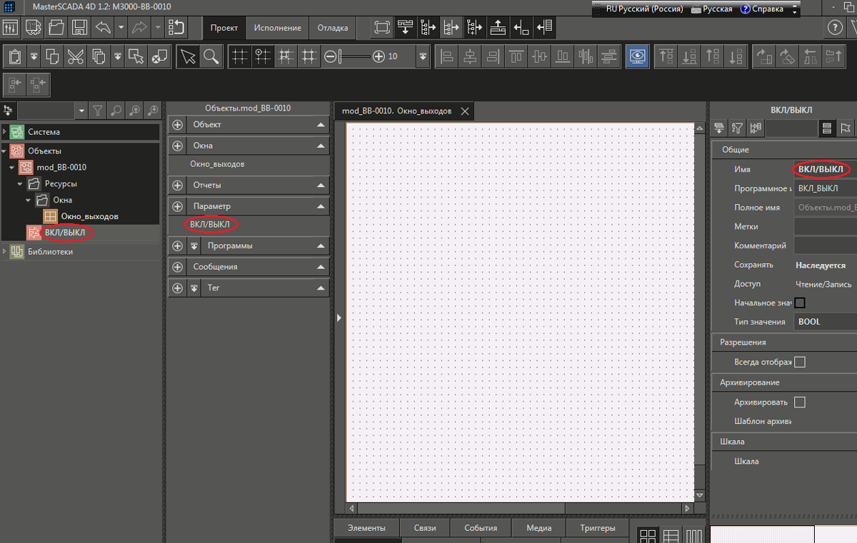 Рис. 42. Среда разработки и последовательность действий по «связыванию» параметра ВКЛ/ВЫКЛ объекта mod_BB-0010 Value