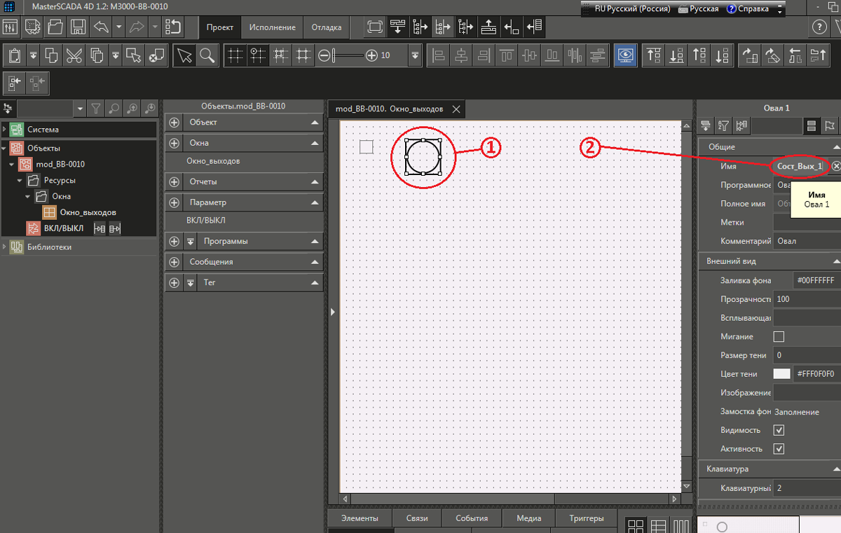 Рис. 19 Окно среды разработки после «привязки» свойства «Заливка фона» графического примитива с именем «Сост_Вых_1» окна «Окно_выходов» к параметру ВКЛ/ВЫКЛ объекта «mod_BB-0010».