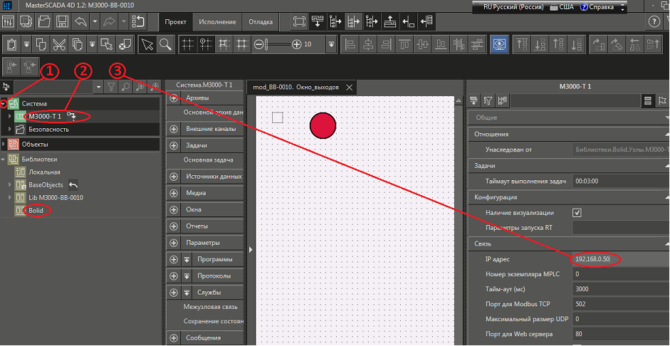 Рис. 41. Среда разработки и последовательность действий по добавлению в проект контроллеру М3000-Т в протоколе ModBus RTU ведомого модуля М3000-ВВ-0010.