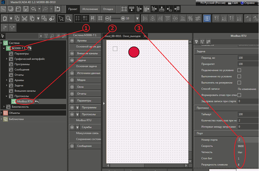 Рис. 40. Среда разработки и последовательность действий по указанию порта и его настроек контроллеру М3000-Т в протоколе ModBus RTU.