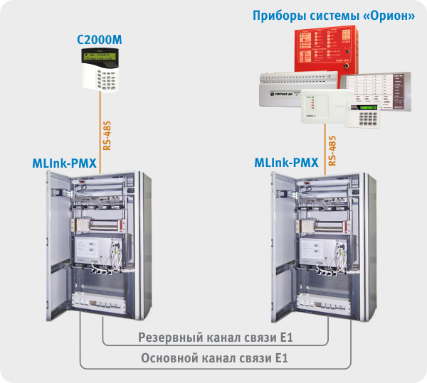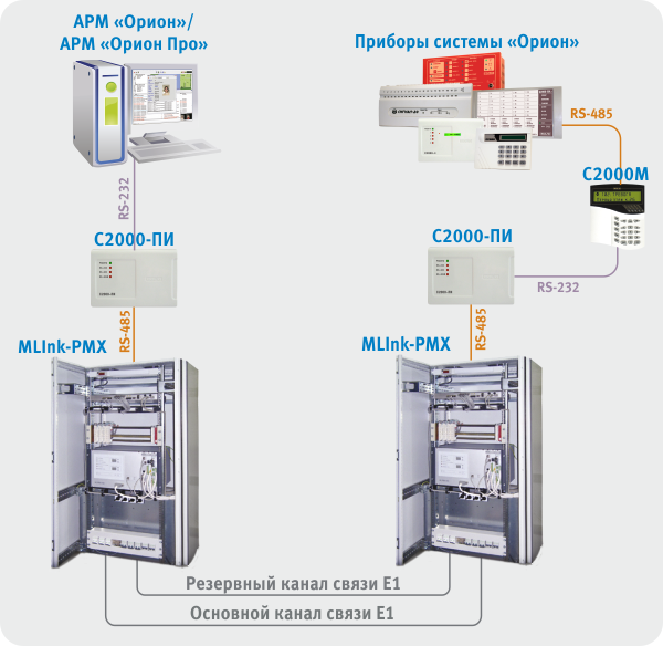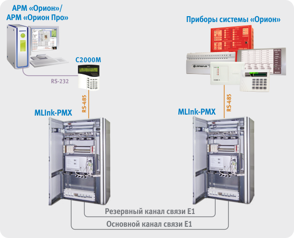 Были проведены испытания системы «Орион» с применением мультиплексоров MLink- PMX производства ООО «Микролинк-связь» (Россия) для передачи сообщений через канальный интервал(64кбит/с) цифрового потока 2048кбит/с (Е1 по рек. МСЭ-Т G.703/G/704) между ПЭВМ с АРМ «Орион»/ «Орион Про» или пультом С2000М и удаленными приборами системы.