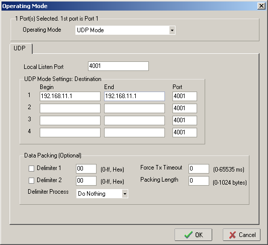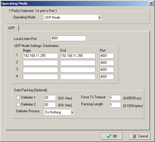 Примечание: заданный адрес 192.168.11.255 – широковещательный адрес для сети 192.168.11. Если используется другая адресация в сети, то необходимо ввести адрес используемой Ethernet сети и в качестве узла задать 255. Если количество удаленных точек не более 2-3, для локализации трафика возможно уазывать IP-адреса удаленных Nport’ов.