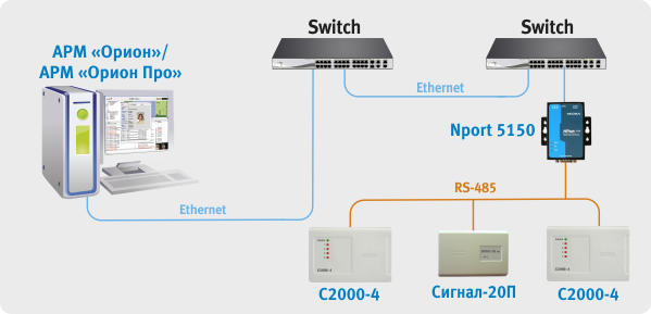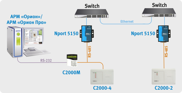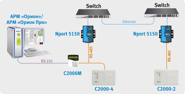 Компьютер с АРМ «Орион»/АРМ «Орион Про» и NPort 5150 подключаются к локальной сети. На выходе NPort 5150 RS-232 далее С2000, на выходе RS-485 к приборам.