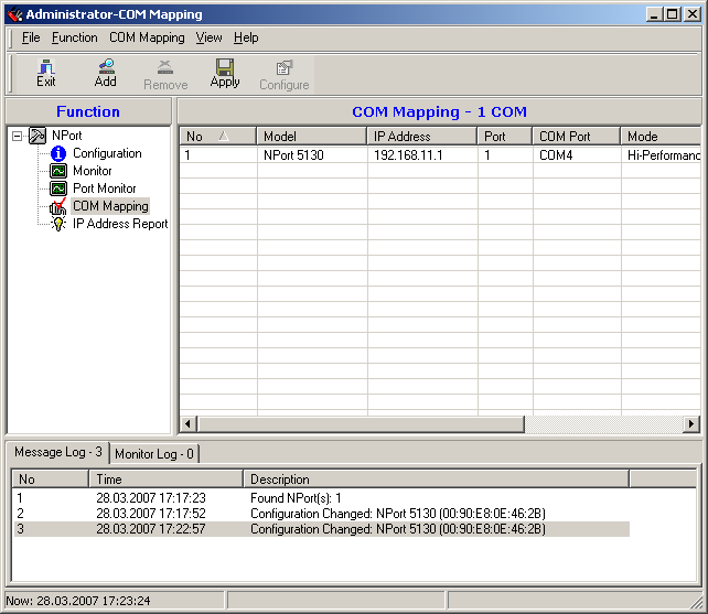 После чего выбрать в списке «Function» параметр «COM Mapping» и нажать на кнопку «Add». В появившемся окне необходимо выбрать Nport 5130 и нажать кнопку «OK». В результате в списке «COM Mapping» появится новая запись с информацией о подключенном устройстве: