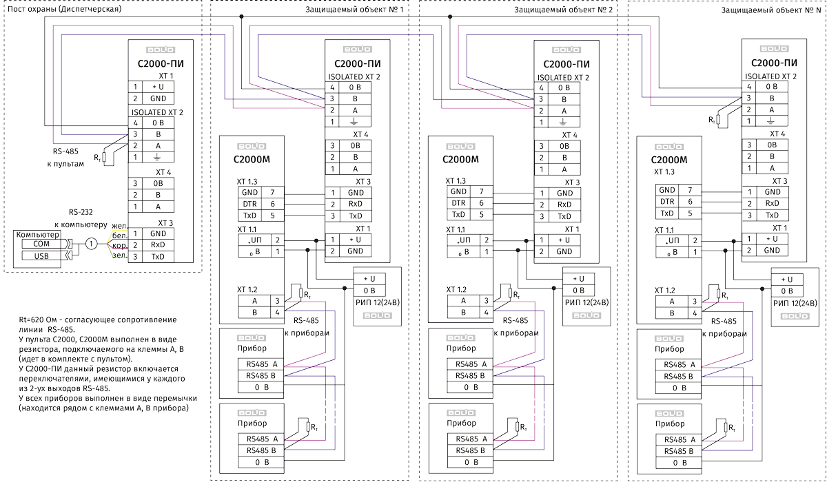 Как уже было сказано, такая схема применяется в случае, если к COM-порту нужно подключить несколько устройств. При использовании АРМ «Орион Про» каждый пульт можно подключать к своему COM-порту (используя схему с гальванической изоляцией или без).