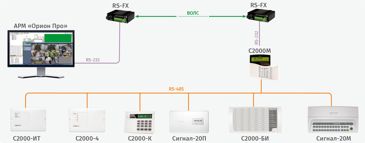 Типовая схема работы преобразователей RS-FX по протоколу «Орион Про»