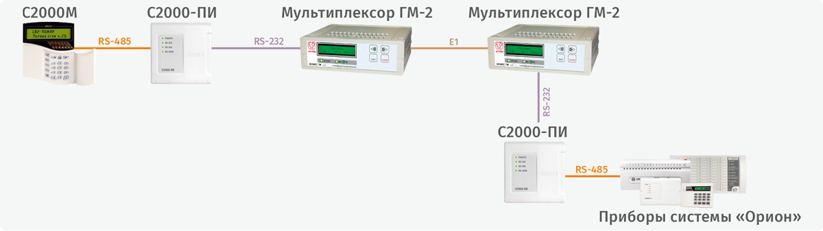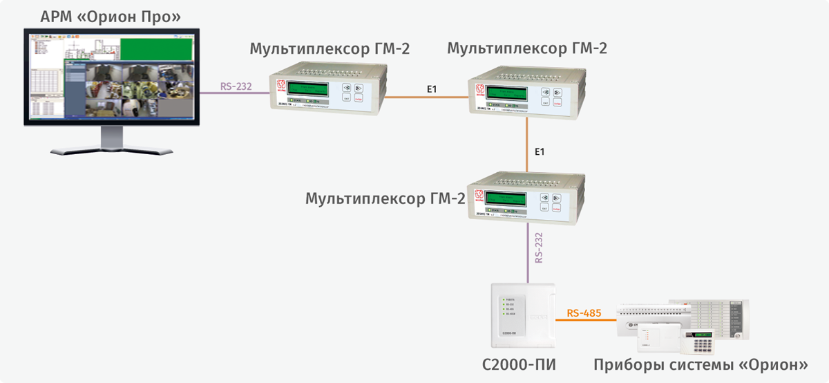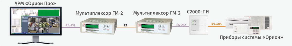 Структурная схема использования мультиплексора «ГМ-2» с АРМ «Орион Про» с подключением промежуточного мультиплексора (ремультиплексирование)