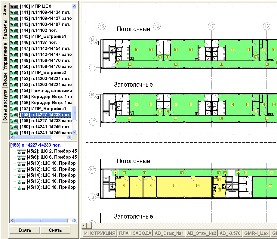 Объект является расширением существующей системы установленной в рамках первой очереди по реконструкции строения АБК ООО Грундфос-Истра», где построение АСПС, в части взаимодействия пожарной сигнализации с другими системами и инженерным оборудованием объекта (раздел14 СП 5.13130.2009) выполнено на исполнение п.14.2 СП5, где система оповещения и управления эвакуацией 2-го типа запускается с одного извещателя. Объём АСПС включает решения по интеграции оборудования НВП Болид с системой контроля доступа на оборудовании «КОДОС» (требование заказчика) в части реализации разблокирования дверей при пожаре, и планового управления открытием требуемых дверей в режимах свободного прохода по расписанию и запросам оператору. Задача решена установкой С2000-СП2 и усилительных реле УК-ВК в шкафах СКУД «КОДОС», что обеспечивает разблокирование дверей при любом состоянии оборудования «КОДОС» На объекте реализованы штатные решения по выдаче команд на противопожарные шторы, шкафы общеобменной вентиляции, зенитные фонари, и систему диспетчеризации. Питание АСПС и СОУЭ осуществляется от блоков резервированного питания БИРП-24/4 (указание управляющей компании).