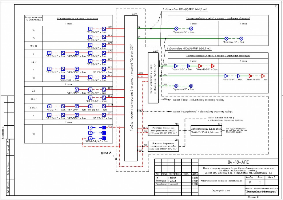 Система автоматической пожарной сигнализации в здании центра культуры и досуга Лукьяновского казачьего сельского поселения смонтирована по проекту "04-18-АПС" на основе приборе приёмно-контрольный охранно-пожарный "Сигнал-20М". Система автоматической пожарной сигнализации осуществляет передачу сигнала "Пожар" и "Неисправность" на пульт ПЦН.
