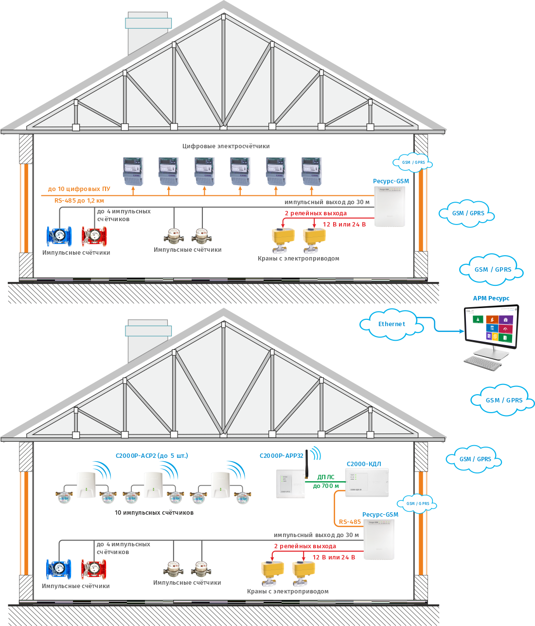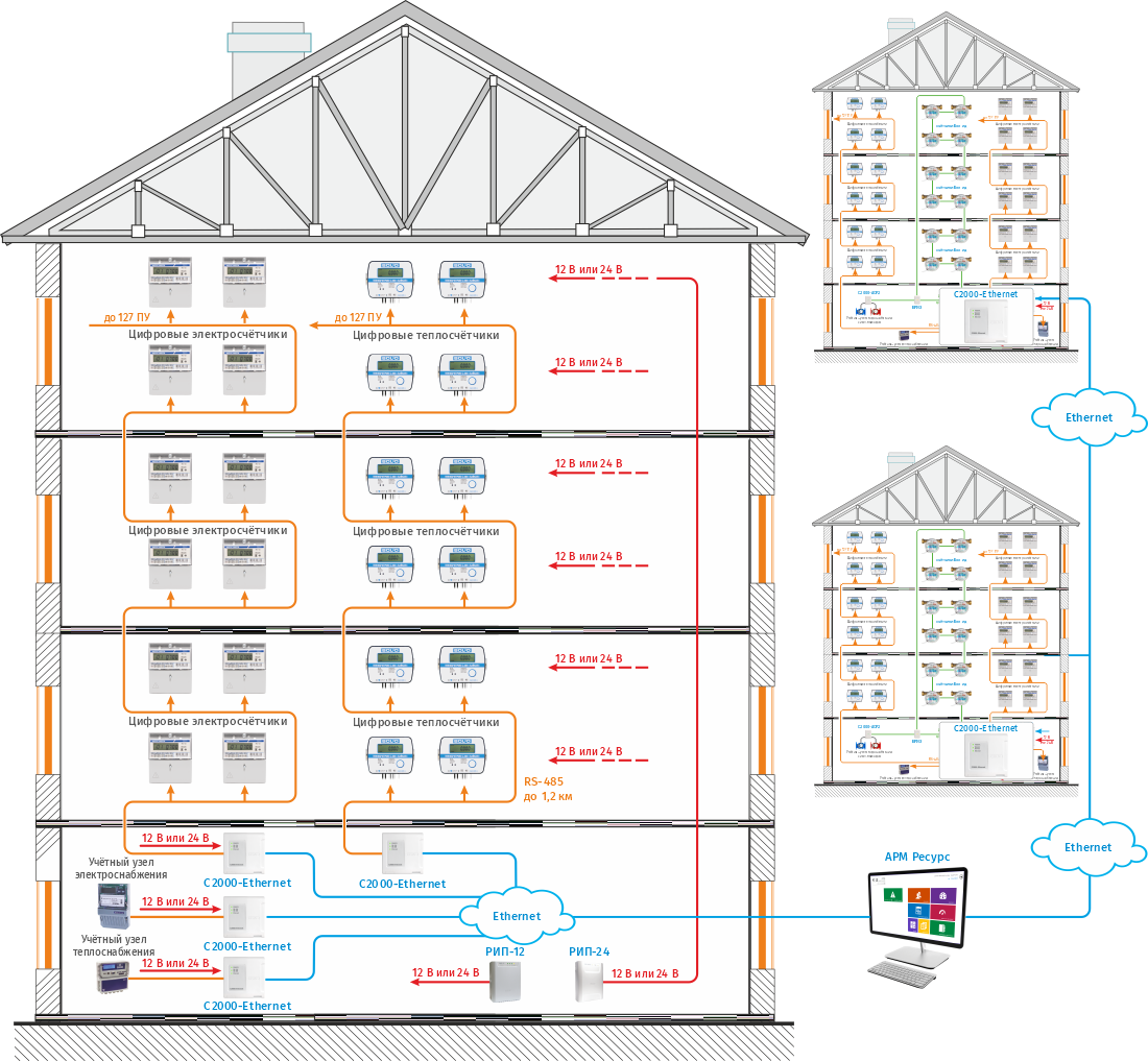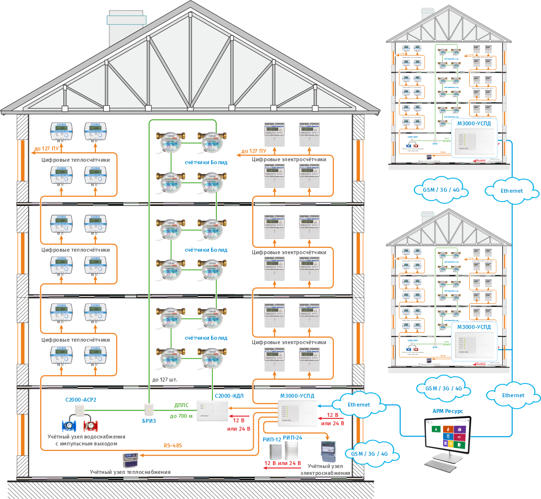 Сбор показаний с импульсных счетчиков организуется с помощью проводных адресных регистраторов импульсов С2000-АСР2 и/или С2000-АСР8 и контроллера двухпроводной линии связи С2000-КДЛ. С2000-АСР2 и С2000-АСР8 подсчитывают импульсы от счетчиков и по ДПЛС передают данные о расходе на сетевые контролеры С2000-КДЛ. Последние преобразуют сигнал ДПЛС в сигналы двухпроводного магистрального интерфейса RS-485, обеспечивают адресацию счетчиков, накапливают и хранят текущие показания счетчиков и по запросу ПО АРМ "Ресурс" передают данные на ПК для обработки и отображения информации. Подключение контроллеров С2000-КДЛ к серверу с ПО АРМ «Ресурс» осуществляется через соответствующий преобразователь интерфейсов, С2000-Ethernet или С2000-USB.