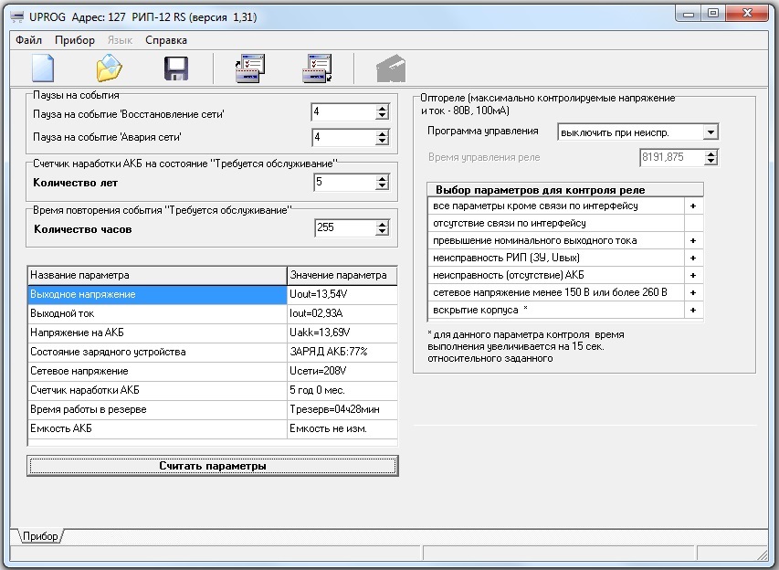 Другим направлением снижения трудозатрат на обслуживание является автоматизация мониторинга состояния АКБ с удаленной передачей информации посредством высокоинформативных протоколов. В резервированных источниках питания аккумуляторные батареи работают, в основном, в буферном режиме: батарея постоянно подключена к зарядному устройству и нагрузке. При переходе на резервный режим токовая нагрузка передается аккумуляторной батарее. Если это происходит в течение длительного времени, то при разряде АКБ и достижении напряжения на ее клеммах 10В источник питания должен отключить батарею от нагрузки. В противном случае батарея может полностью разрядиться и стать непригодной. Следовательно, необходимо использовать источники питания с защитой от глубокого разряда, который сможет вовремя отключить батарею от нагрузки, а при возобновлении сетевого питания — зарядить ее. Источники питания РИП-12 RS, РИП-24 RS с не только имеют интеллектуальный контроль АКБ и могут управлять их зарядом, но и имеют встроенный интерфейс RS-485. Данные источники питания способны рассчитать время работы в резервном режиме с учетом фактического тока нагрузки и передать эти данные на контрольное устройство по интерфейсу RS-485. Например, информационный обмен возможен с помощью сервисной компьютерной программы UPROG: можно контролировать уровень заряда АКБ, оставшееся время работы в резерве, отследить изменения емкости АКБ, также можно запустить счетчик наработки АКБ для формирования сообщения "Требуется обслуживание".